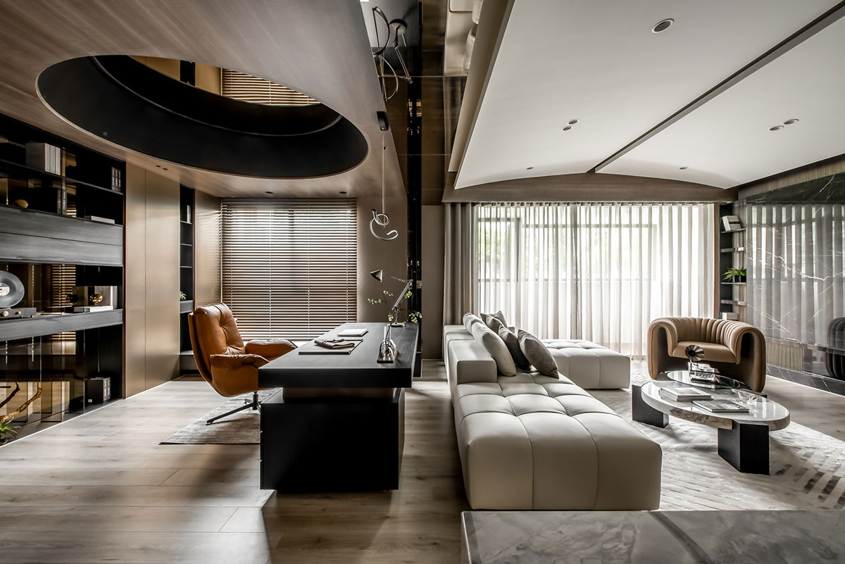 The living and dining areas feature two gracefully curved ceilings that sweep from the entryway to the French windows, accentuated by recessed and linear lighting features that evoke the vibrant grandeur of the communal spaces. Adjacent to these areas lies an open study, distinguished by a dome-vaulted ceiling crafted from wood and mirrored surfaces, resulting in a serene and refreshing workspace. This design masterfully achieves a harmonious balance, offering a tranquil sanctuary that elegantly blends diverse elements.