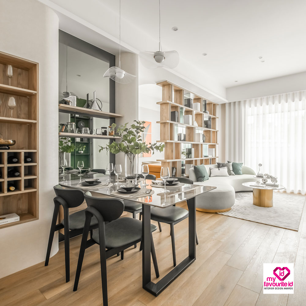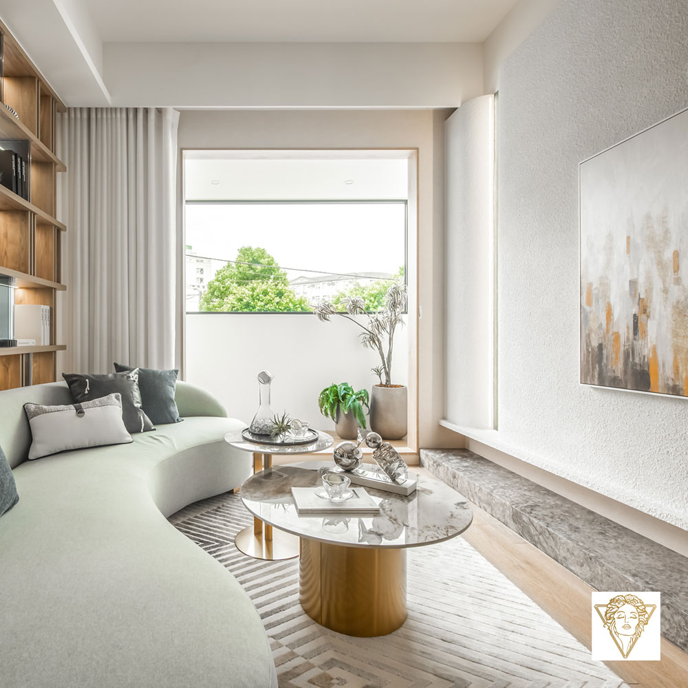 The outdoor greenery melds with the interior seamlessly as sunlight streams through open windows. The space is an artful composition of wooden hues, green walls, and stone textures, achieving a dynamic equilibrium between tangible and intangible elements. Earthy tones form a soft, inviting foundation, while gentle, curving lines are gracefully woven throughout, evoking a sense of natural warmth.