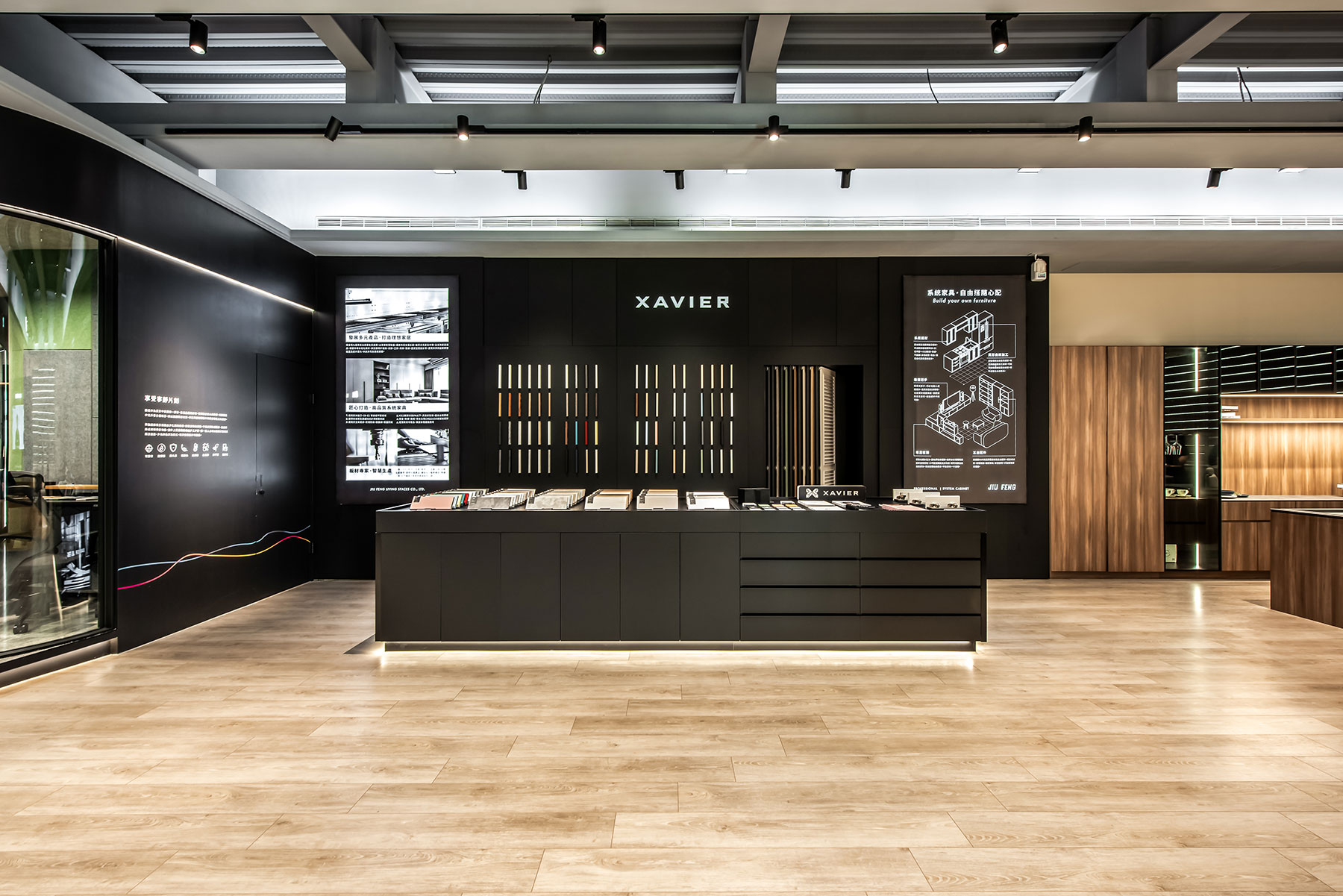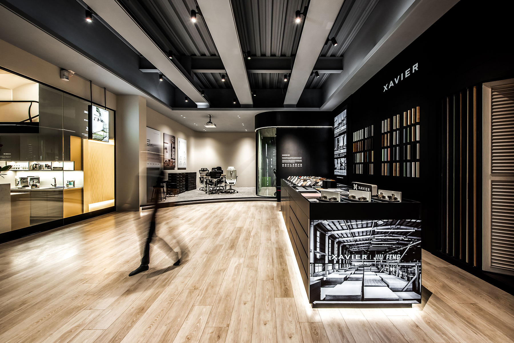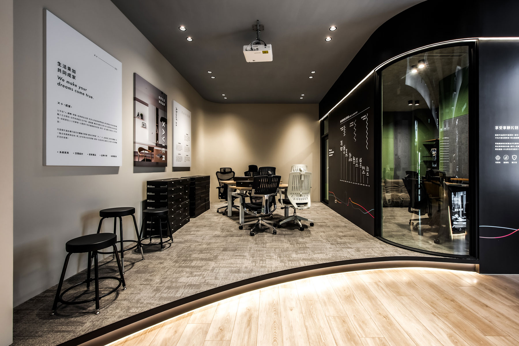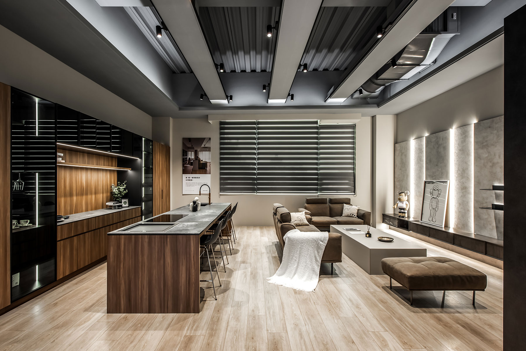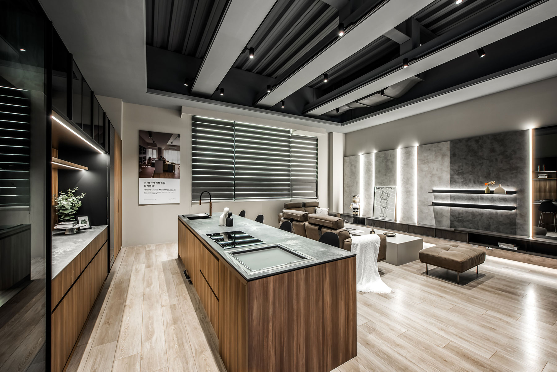回應突破品牌、追求年輕化的主軸,以及產品展示需求,設計師以商空形象色的黑調鋪敘空間基底,並圍繞公司主打商品——系統板進行巧思搭配,利用其花色,將材質之美淋漓盡致地展現;櫥櫃、家具擺放的靈活發揮,勾勒出通透卻層次分明、細膩而豐富的視覺語言,而電視牆、櫃體內間接照明佐搭跳脫色調的產品更是相得益彰,沉穩卻不沉悶,展品魅力得以充分彰顯之餘,象徵企業開啟新篇章,達到創新與傳承的完美平衡。