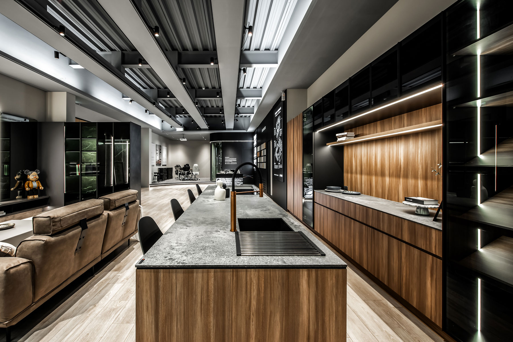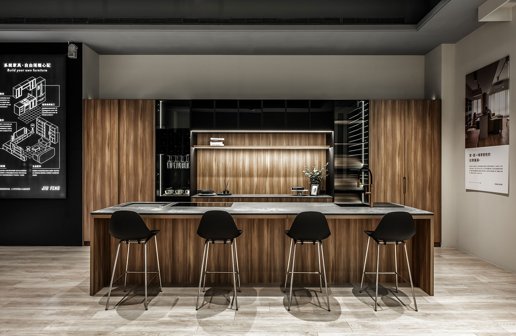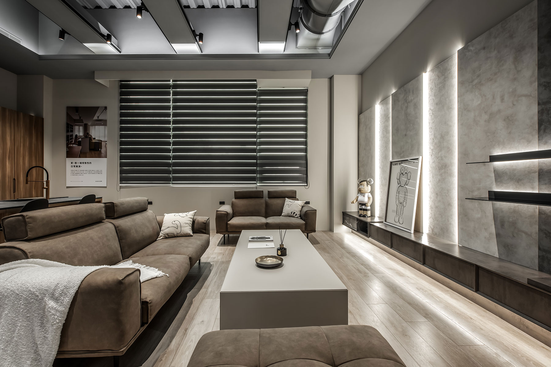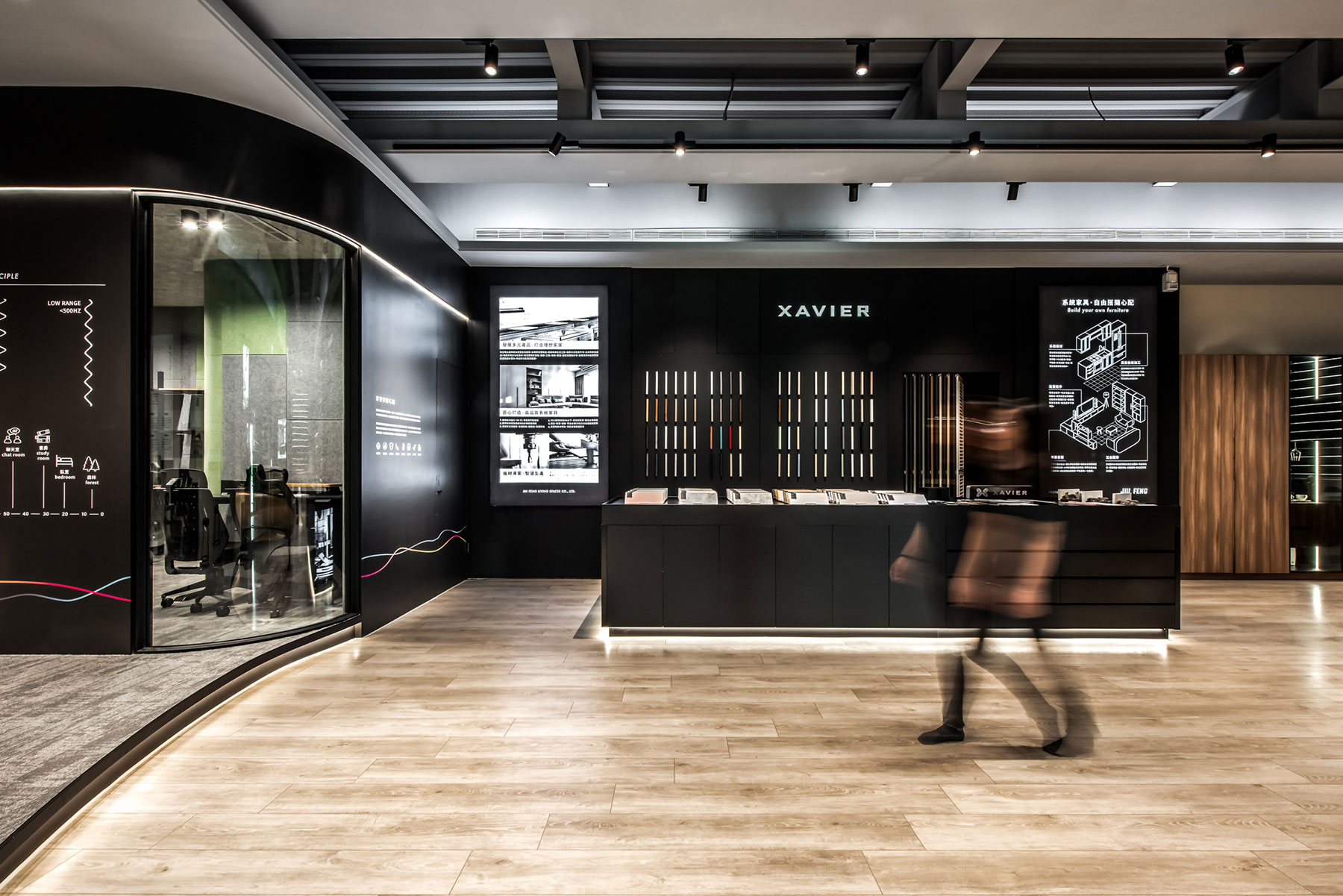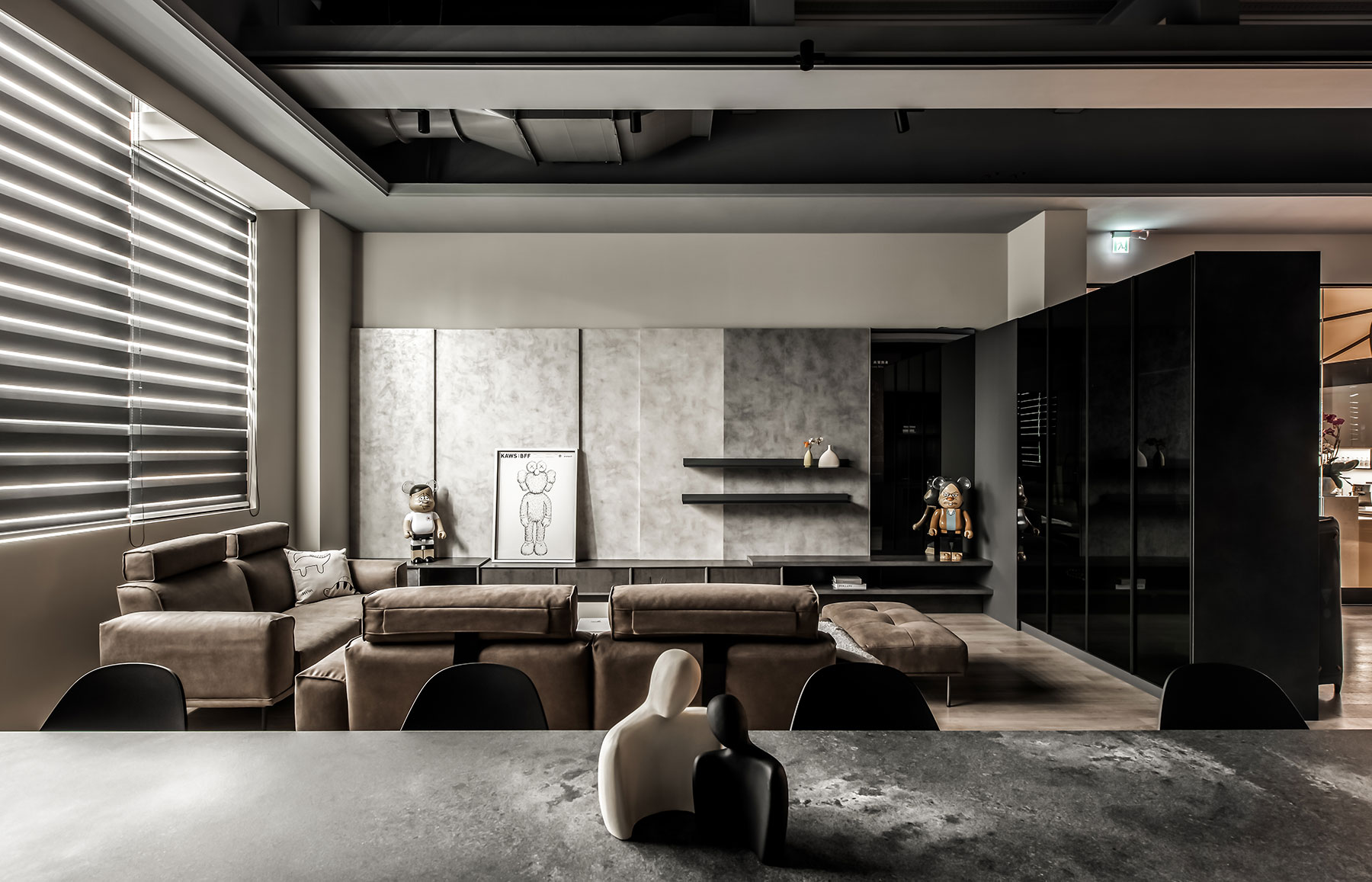 回應突破品牌、追求年輕化的主軸,以及產品展示需求,設計師以商空形象色的黑調鋪敘空間基底,並圍繞公司主打商品——系統板進行巧思搭配,利用其花色,將材質之美淋漓盡致地展現;櫥櫃、家具擺放的靈活發揮,勾勒出通透卻層次分明、細膩而豐富的視覺語言,而電視牆、櫃體內間接照明佐搭跳脫色調的產品更是相得益彰,沉穩卻不沉悶,展品魅力得以充分彰顯之餘,象徵企業開啟新篇章,達到創新與傳承的完美平衡。
