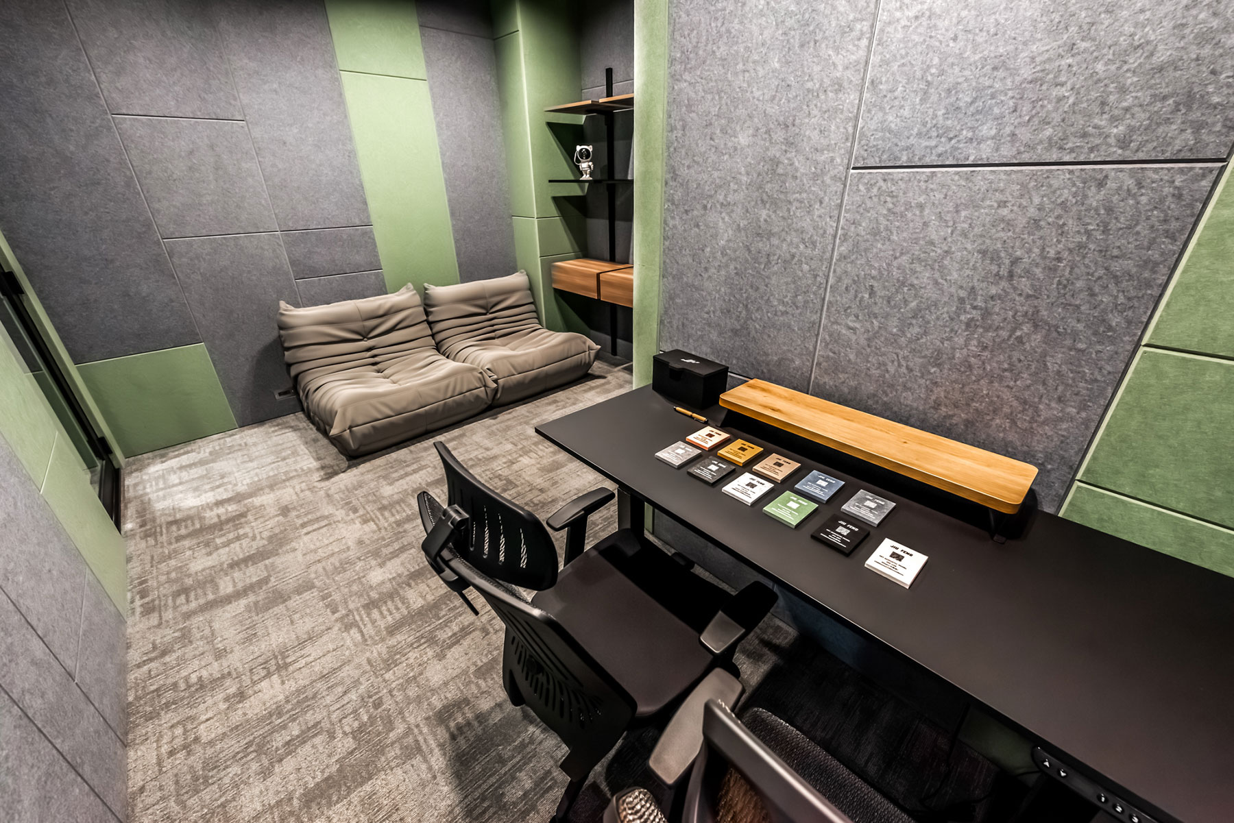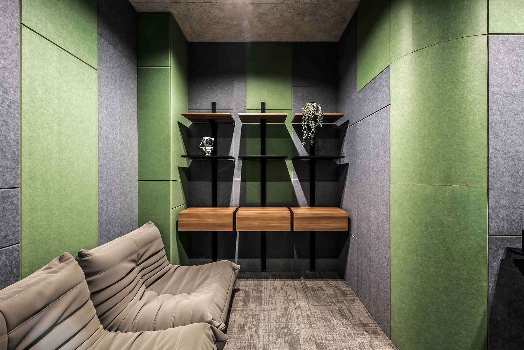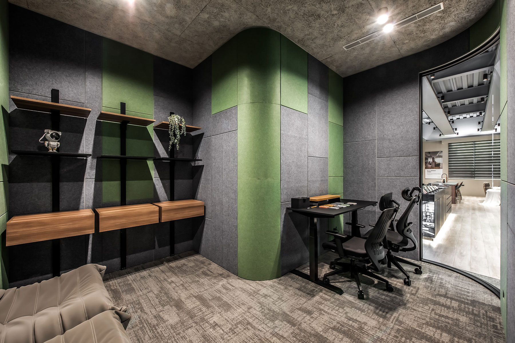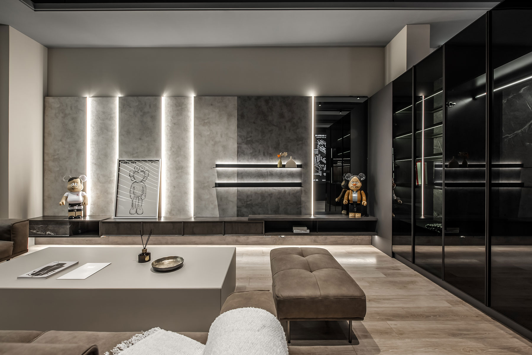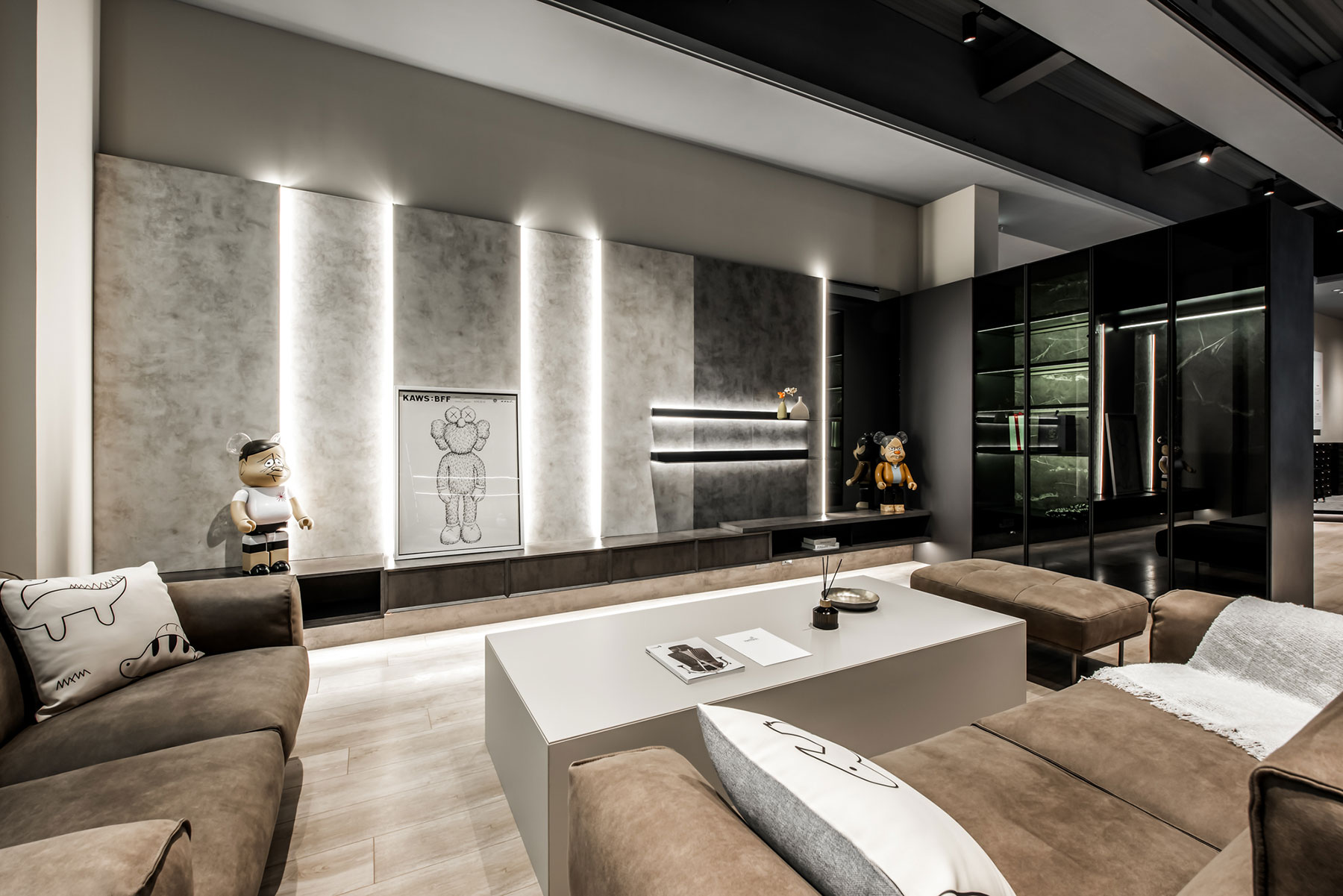 回應突破品牌、追求年輕化的主軸,以及產品展示需求,設計師以商空形象色的黑調鋪敘空間基底,並圍繞公司主打商品——系統板進行巧思搭配,利用其花色,將材質之美淋漓盡致地展現;櫥櫃、家具擺放的靈活發揮,勾勒出通透卻層次分明、細膩而豐富的視覺語言,而電視牆、櫃體內間接照明佐搭跳脫色調的產品更是相得益彰,沉穩卻不沉悶,展品魅力得以充分彰顯之餘,象徵企業開啟新篇章,達到創新與傳承的完美平衡。