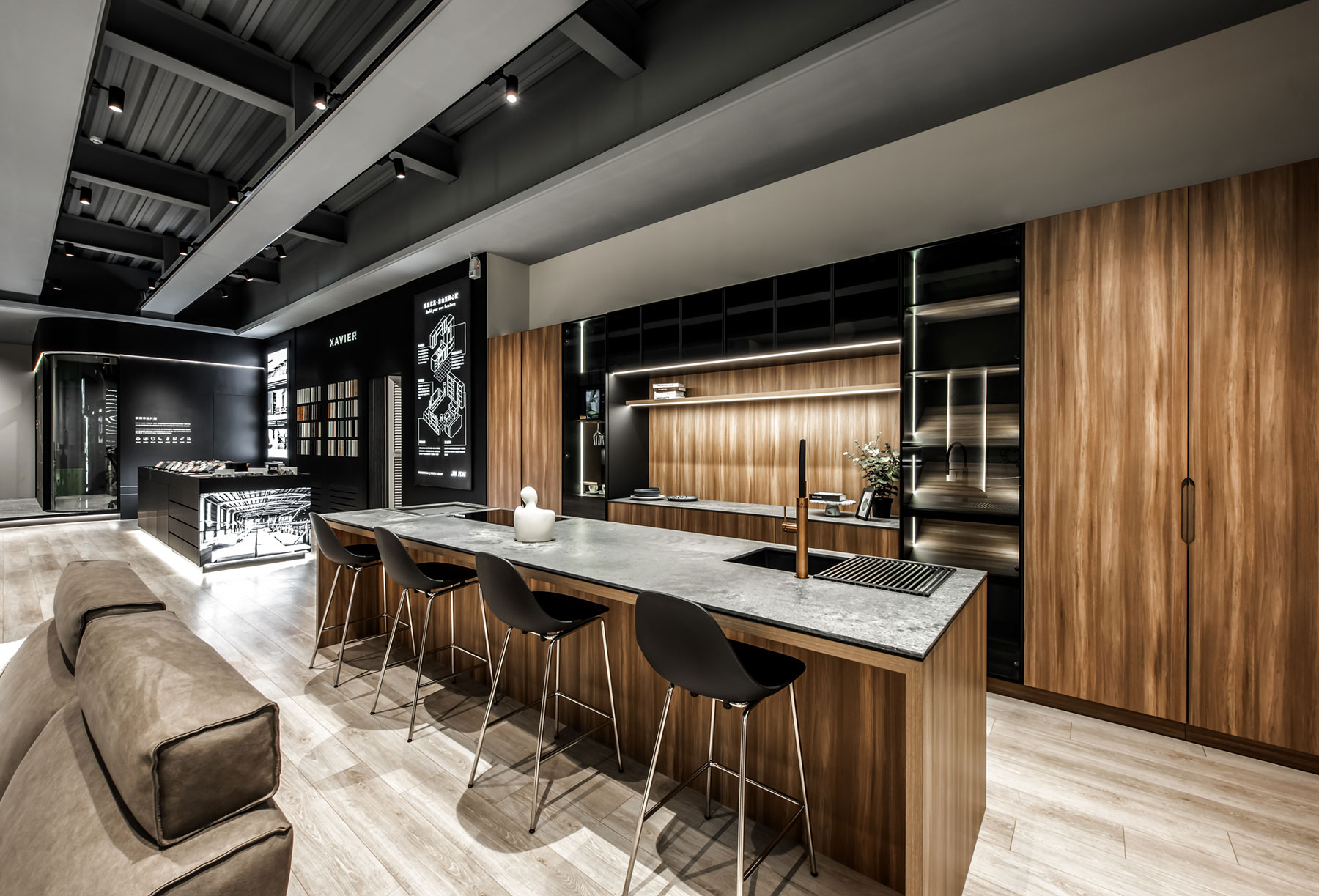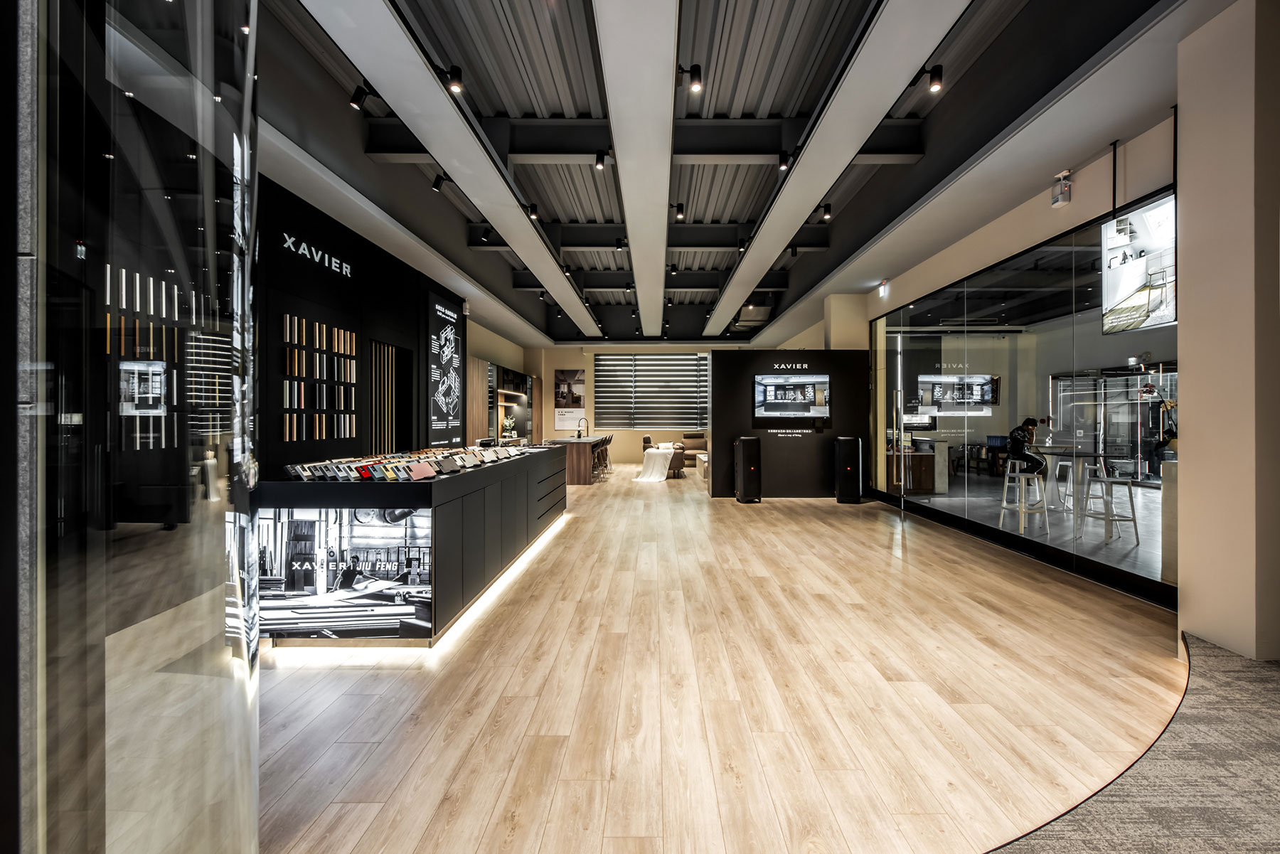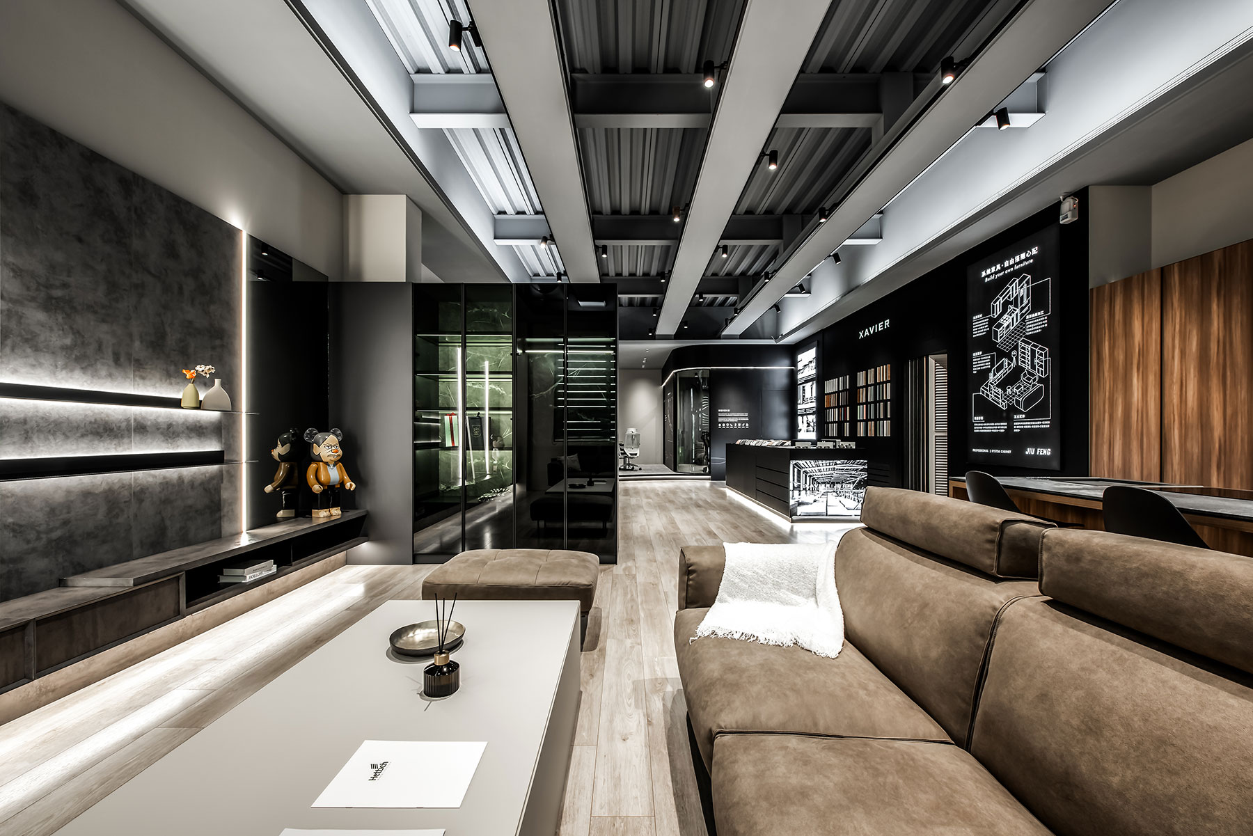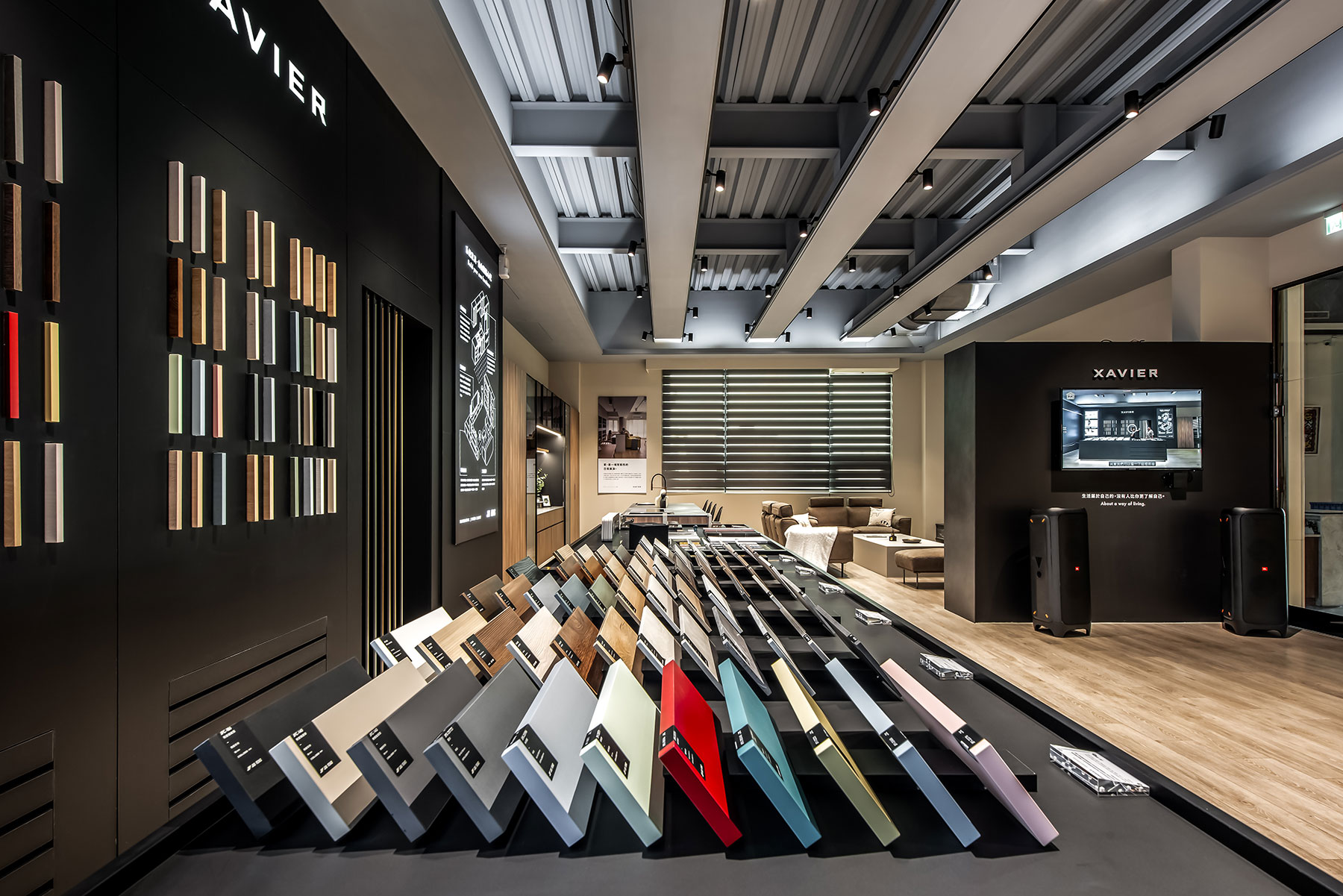 The designer adopted the brand color- black to pave the background in response to the rejuvenation of branding and product display. Skillfully mix and match colors and textures dashingly highlight the main product- slab board; active furniture staging sets a rich, delicate, and airy visual layering. In addition, the indirect lighting from the TV wall and cabinetry, imposingly but not drearily, matches products in flashing colors. It signifies a great harmony between innovation and heritage and a new business chapter.